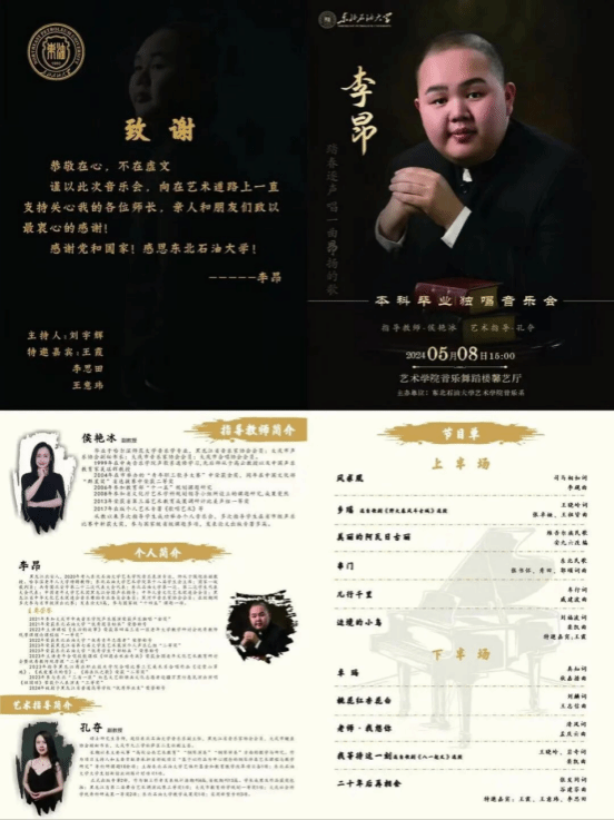 2024年5月8日下午15时,音乐系2024届毕业生李昂在东北石油大学beat365正版唯一官网必一馨艺厅成功举办了“踏春逐声,唱一曲昂扬的歌”本科毕业独唱音乐会。beat365正版唯一官网必一党委书记张金辉、院长林庆华、党委副书记张丽坤、副院长王靖一、各系(中心)负责人以及音乐系师生观看了本场音乐会。