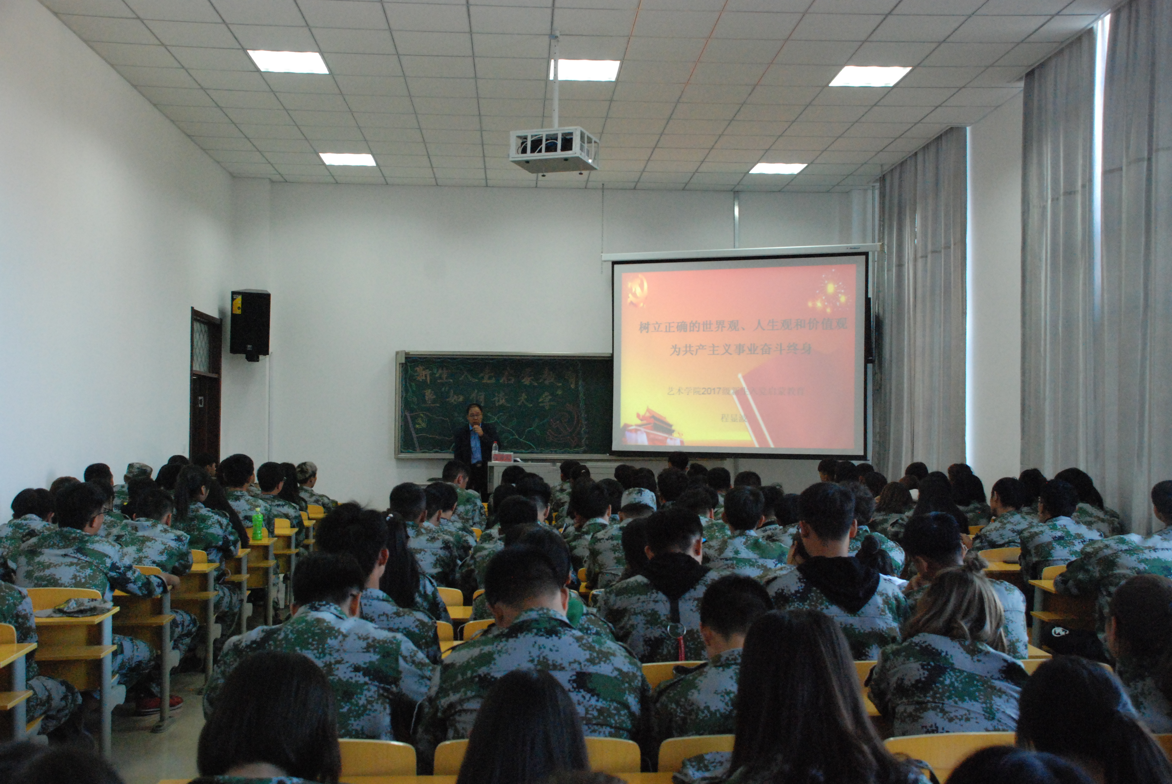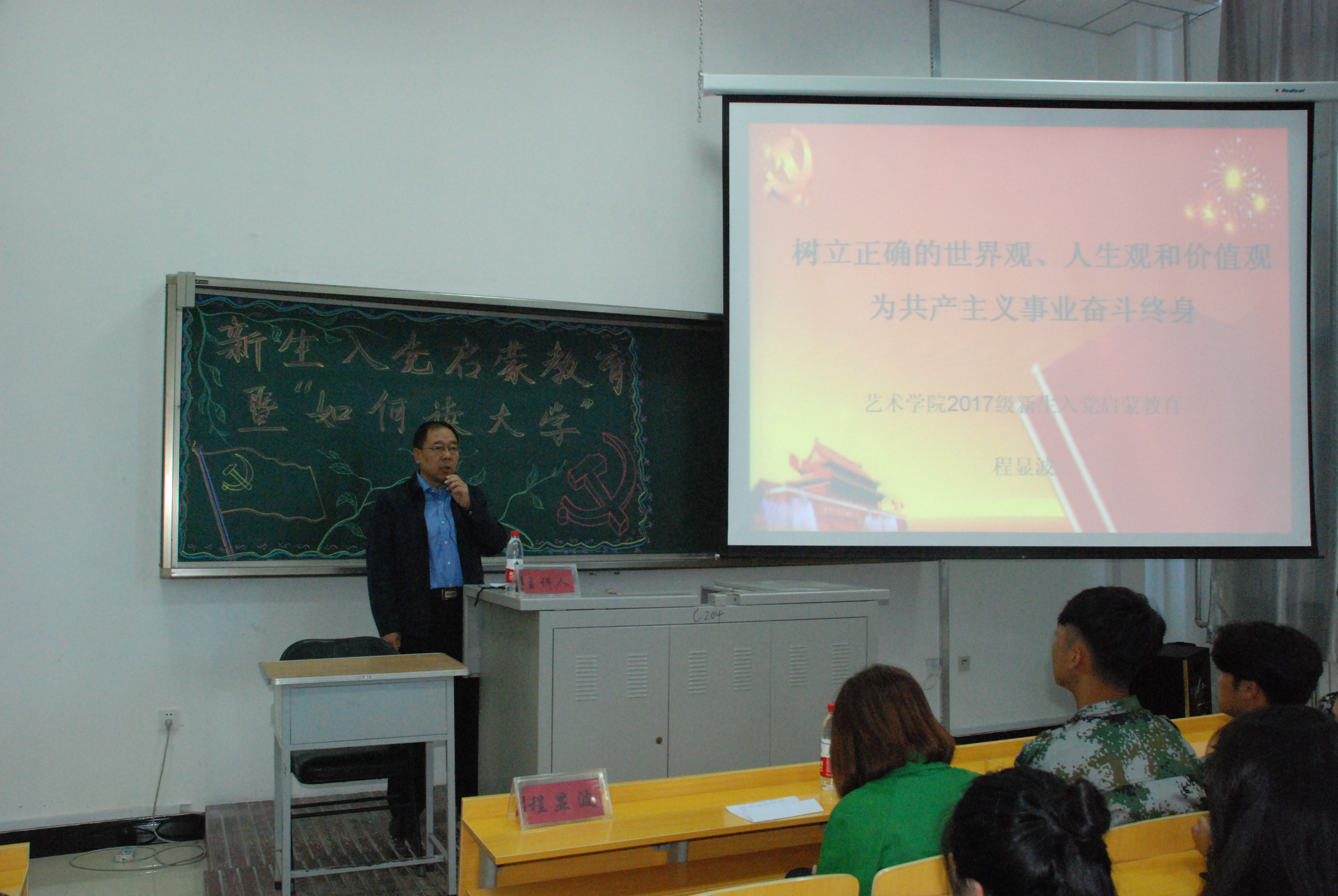 为增强新生对党的认识,端正入党动机,2017年9月14日十点在美术设计¥104教室召开2017级新生入党启蒙教育,程显波书记做了题为“树立正确的世界观人生观和价值观,为共产主义奋斗终身”的专题党课,会议由2017级辅导员关明主持。
