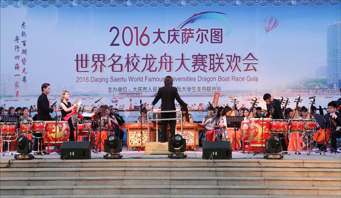 6月19日晚,“龙腾百湖皆兄弟,舟行四海一家亲”2016大庆萨尔图世界名校龙舟赛闭幕式暨联欢晚会在东北石油大学图书馆广场隆重举行。来自世界各地的24所知名高校的龙舟队队员、大学生,以及国际大龙联、大庆市和我校领导,我校师生员工近万人共同观看了精彩晚会表演,此次演出由beat365官网吴晓芳教授担任总导演。在我校代表团表演的八个精彩节目中,beat365正版唯一官网必一共表演了六个极具东方特色的节目,引起全场阵阵沸腾,现场汇聚成一片欢乐的海洋。