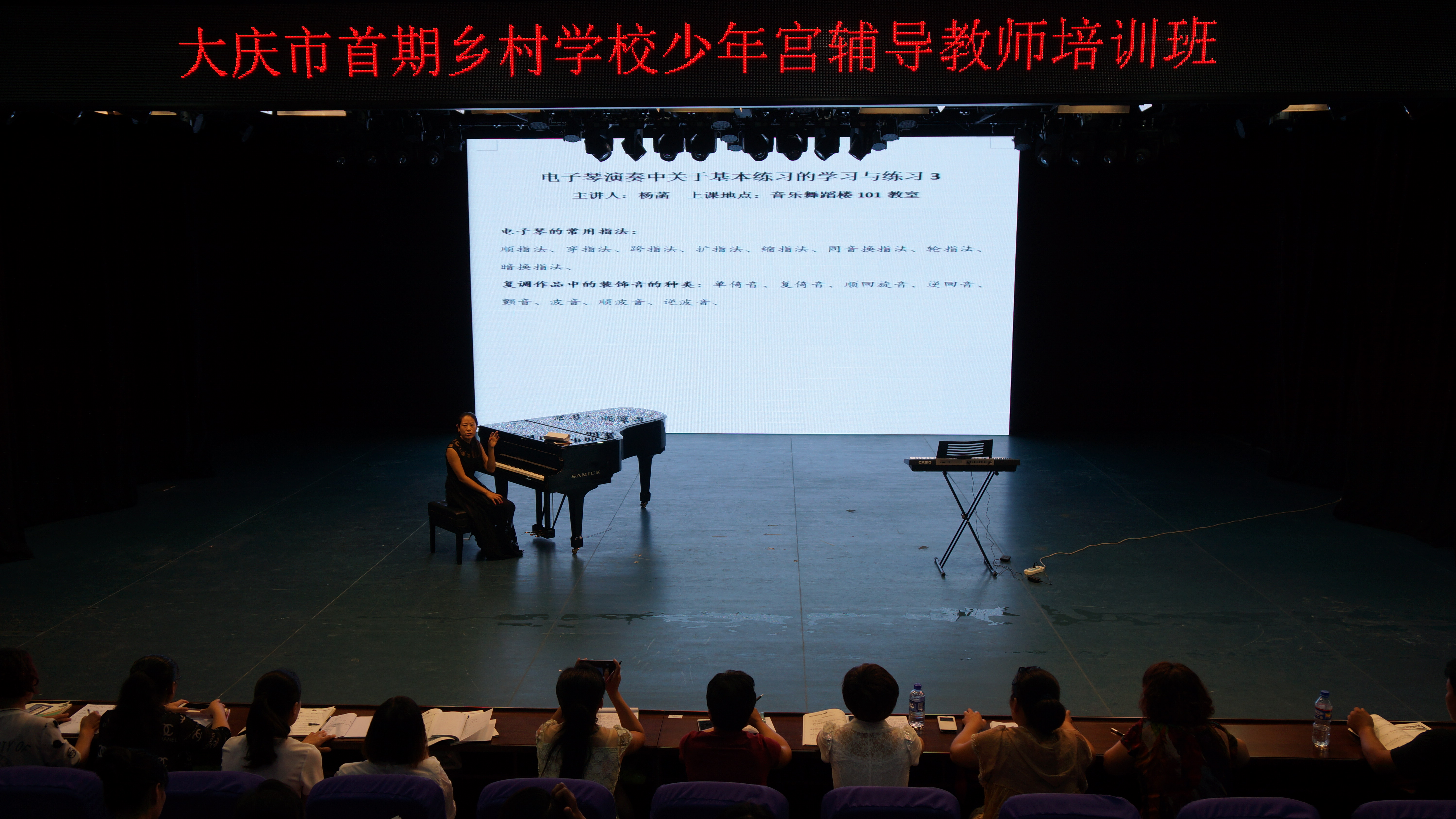 本次培训是大庆市文明办依据《中央专项彩票公益金支持乡村学校少年宫项目管理办法》和《乡村学校少年宫使用管理办法》两个文件精神,通过与我校协商沟通基础上开办的。由我校beat365正版唯一官网必一艺术实践中心承担培训任务,培训时间为7天。培训以集体课与小组课相结合方式进行,主要培训电子琴演奏的基本方法。