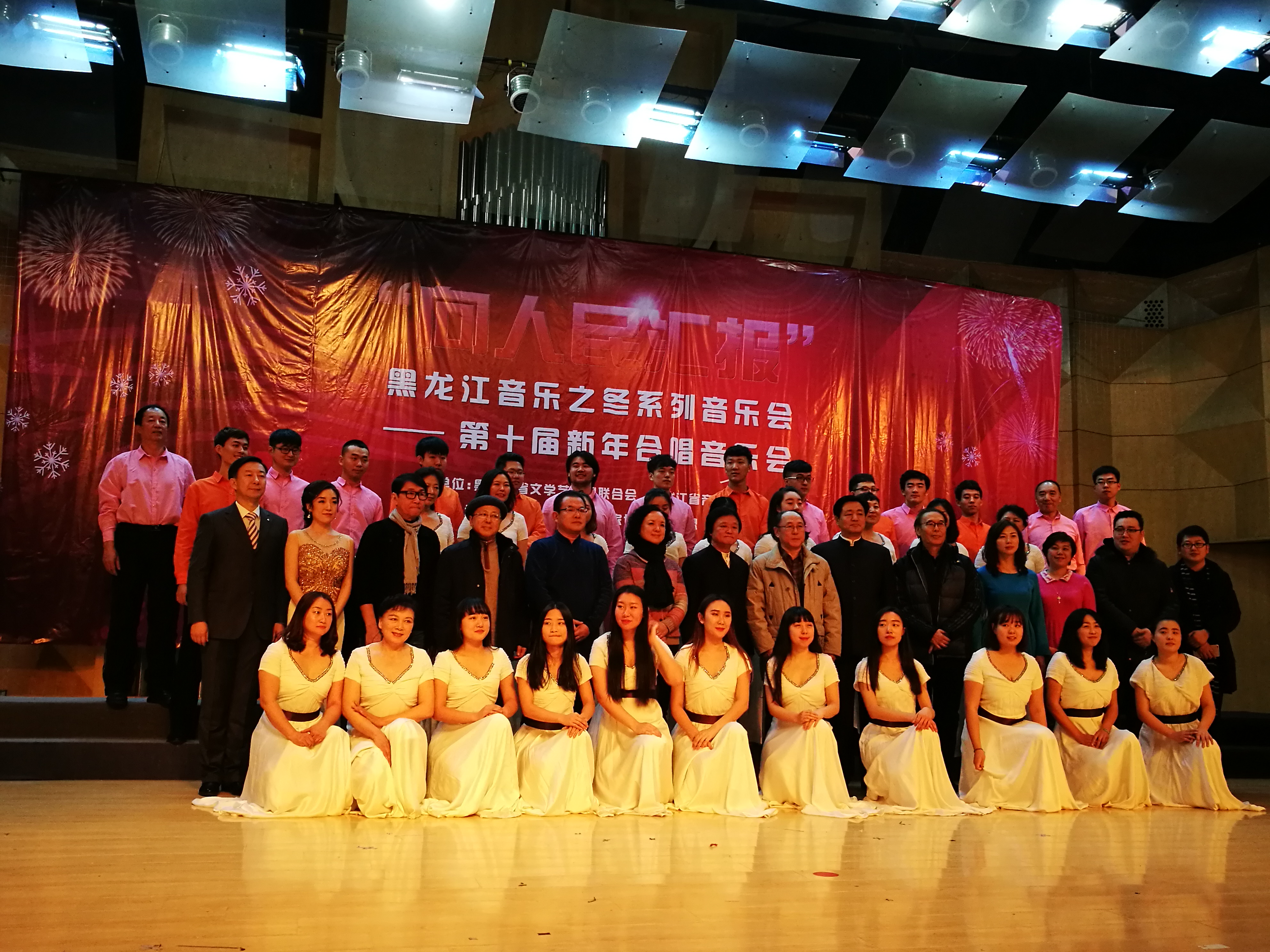 新年合唱音乐会是由黑龙江省文学艺术界联合会、黑龙江省音乐家协会主办,黑龙江省音乐家协会合唱联盟承办,作为黑龙江音乐之冬系列音乐会之一,本届新年合唱音乐会共邀请了来自哈尔滨、牡丹江、大庆、双鸭山、铁力等省内十一支优秀合唱团体参加了演出。音乐会上,我校合唱团演唱了西方经典拉丁文作品《Ave Maria》及极具非洲音乐特色的当代优秀作品《African Alleluia》,合唱团对两首作品的精彩演绎赢得了现场观众的热烈掌声,受到了音乐界专业人士的高度评价。