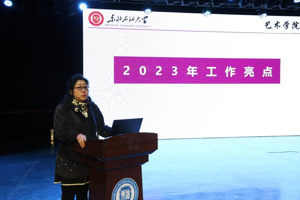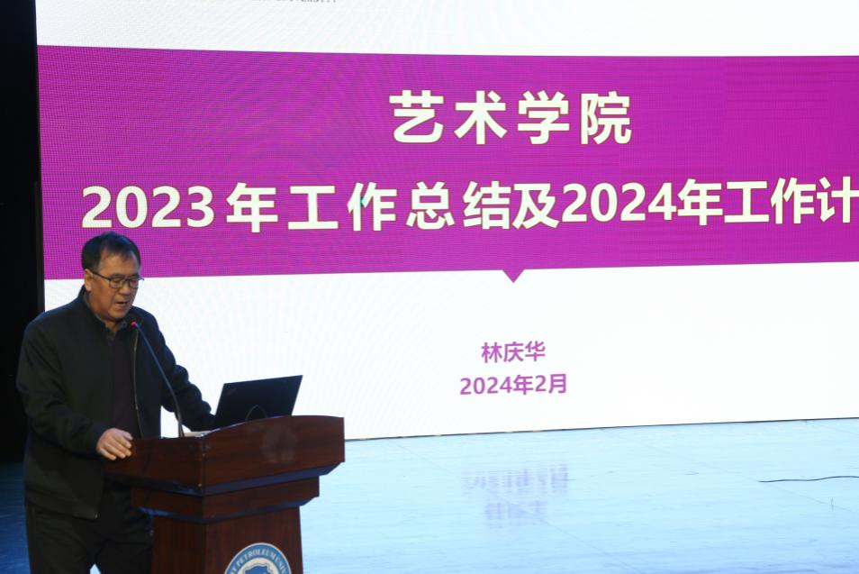会议首先由院长林庆华为全体教职工做工作报告,对学院2023年工作进行通报、对新学期工作进行部署。她重点介绍了学院2023年工作亮点,一是高质量完成学科审核评估工作,并以16票全票顺利通过国务院学位委员会艺术学学科评议组专家评审;二是以艺术特有的方式助力大庆精神办学育人。接着从党建工作、教学工作、学科建设与科研工作、美育工作、学生工作、铁人诞辰一百周年专题活动、院办工作等七个方面叙述2023年学院的工作成绩。然后围绕beat365正版唯一官网必一本学期重点工作、教学科研重点工作、各系重点工作、三中心重点工作四个方面提出新学期工作要点。最后再次强调了beat365正版唯一官网必一本学期的十项重点工作,对本科教学评估院内自评、音乐剧《铁人在非洲》演出、本科毕业设计、研究生毕业答辩、本科生毕业展演、美育教学成果展演、模拟面试工作室、毕业生就业帮扶行动、邀请专家进校学术报告、综合常毕业晚会等十项重点工作做了具体部署,为全院上下提供了明确的指导和工作思路。