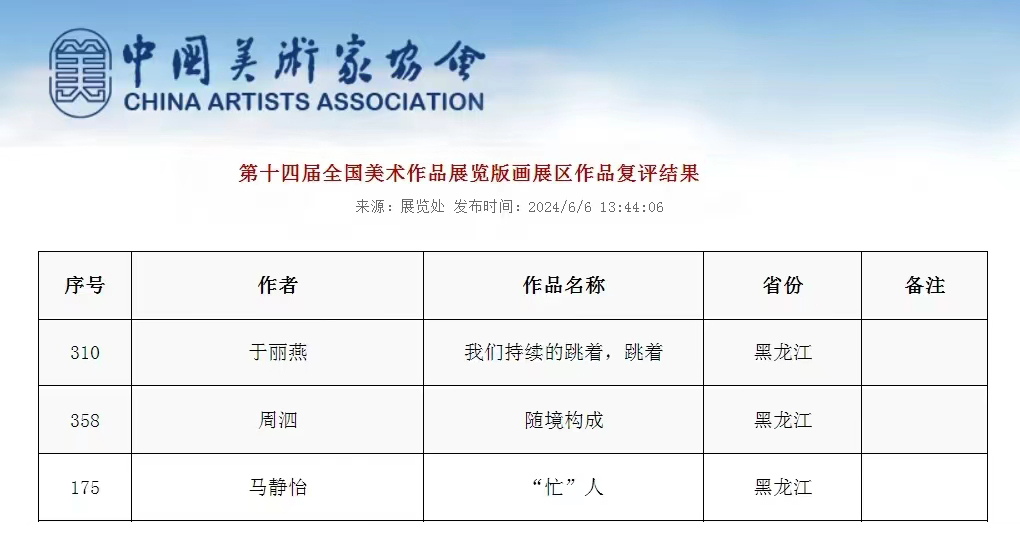 2024年6月6日,中国美术家协会官方网站公布了“第十四届全国美术作品展览版画展区复评结果”,第十四届全国美术作品展览版画展区作品经复评评审委员会评选,入选作品369件。beat365官网版画工作室师生三人于丽燕、周泗老师、马静怡同学的版画作品同时入选本次大展,作为中国规模最大、参与范围最广、作品种类最多、最具影响力和权威性的国家级综合性美术大展,全国美术作品展览(简称“全国美展”)代表了国家美术创作的最高水平,同时也是对全国美术界每五年的发展阶段的全面检阅与展示。