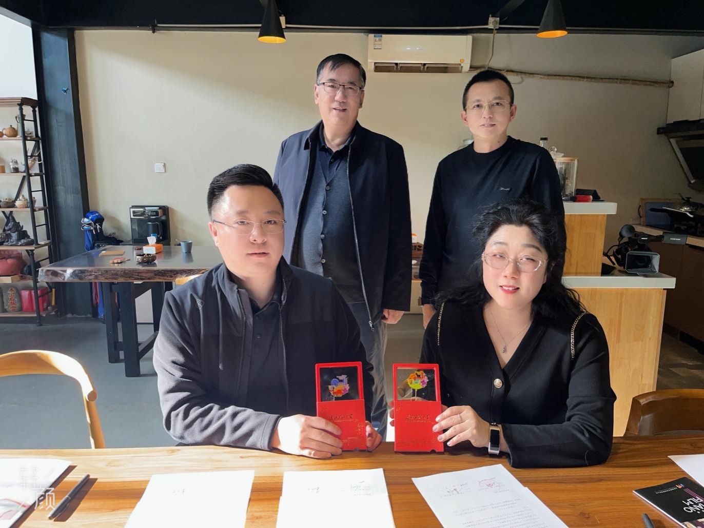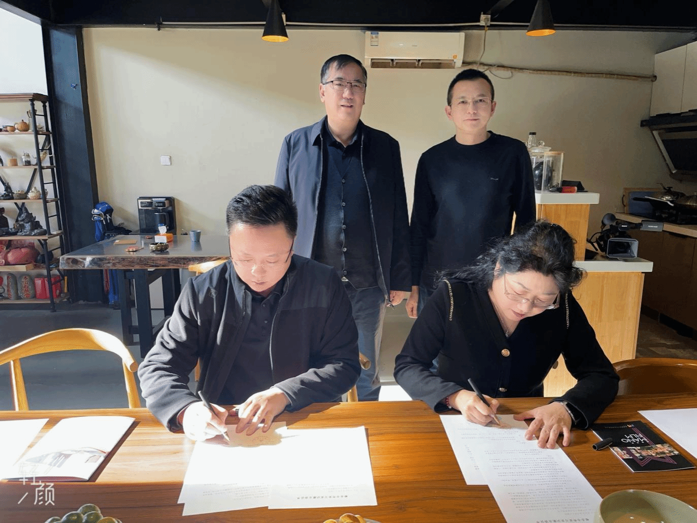 林庆华与董明安签署了《校企合作实习实训就业协议书》,林庆华院长向董明安经理赠送了beat365官网的特色文创徽章。