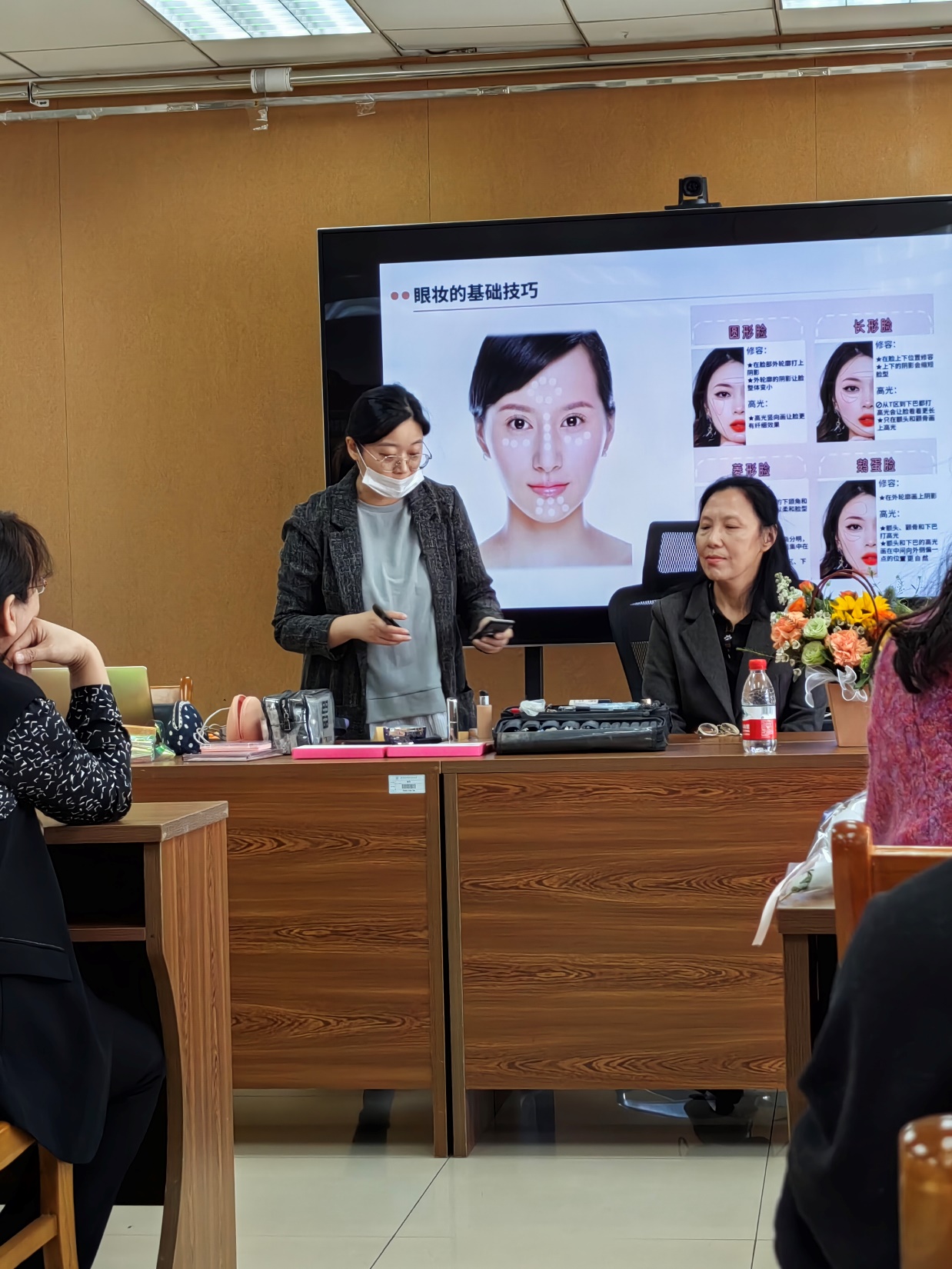 “眼妆是职业妆容的灵魂之笔”“底妆清透才能展现专业感”“眉形与脸型的适配是关键”吕行老师金句频出,现场教职工纷纷拿起手机记录要点,更有老师主动上台担任模特,通过“素颜改妆”环节直观感受妆容对个人气质的提升效果。短短15分钟,模特妆容的转变,引得全场赞叹连连。