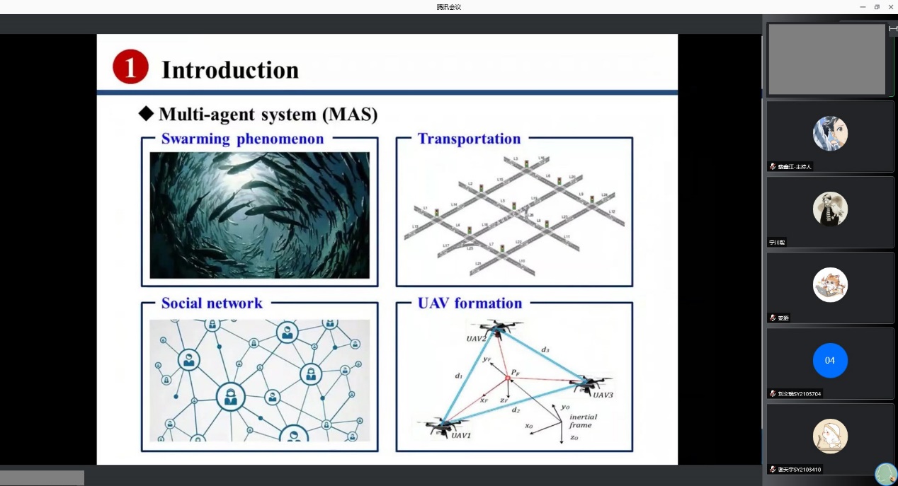 接下来进行分享的是金年会诚信信誉至上2018级博士生张璟尧同学。他以“非线性多智能体网络系统在切换拓扑下的分布式迭代学习控制”为题,整合其发表在AUTOMATICA和IEEE TAC上的两篇论文研究内容进行汇报。张璟尧同学首先简要介绍了迭代学习控制的基本原理与优缺点,并以行进乐队为例,对迭代学习控制的对象——多智能体系统的相关特点与控制目标进行了阐述。随后引入代数图论、联合生成树等知识,设计分布式迭代学习控制协议,将全局Lipschitz条件放松为局部Lipschitz条件,通过理论推导、数值仿真等手段,回答了在具有切换拓扑的非线性多智能体网络系统中如何实现分布式迭代学习控制这一问题。